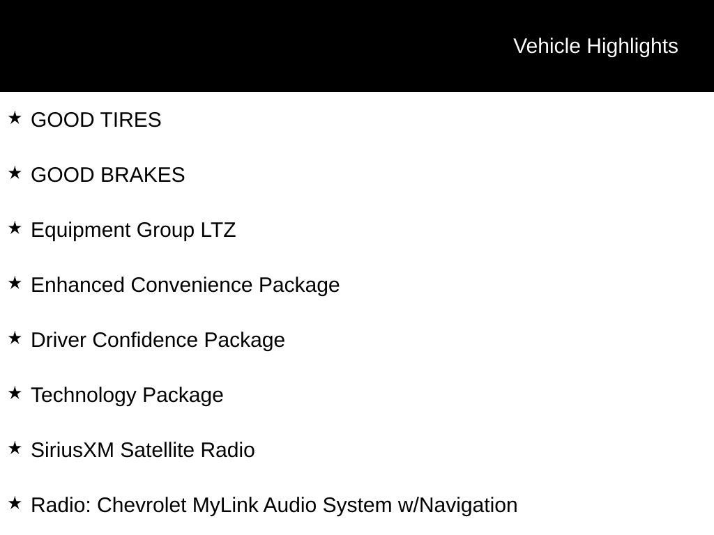 - Audio system, Chevrolet MyLink radio, 7" diagonal color touch-screen display AM/FM/SiriusXM stereo with MP3 playback capability, outside temperature indicator and Radio Data System (RDS), includes Bluetooth streaming audio for select phones; voice-activated technology for radio and phone; Hands-Free smartphone integration with Pandora and Stitcher; Gracenote (Playlist+, Album Art) (May be upgraded to (UHQ) Chevrolet MyLink radio with Navigation.)