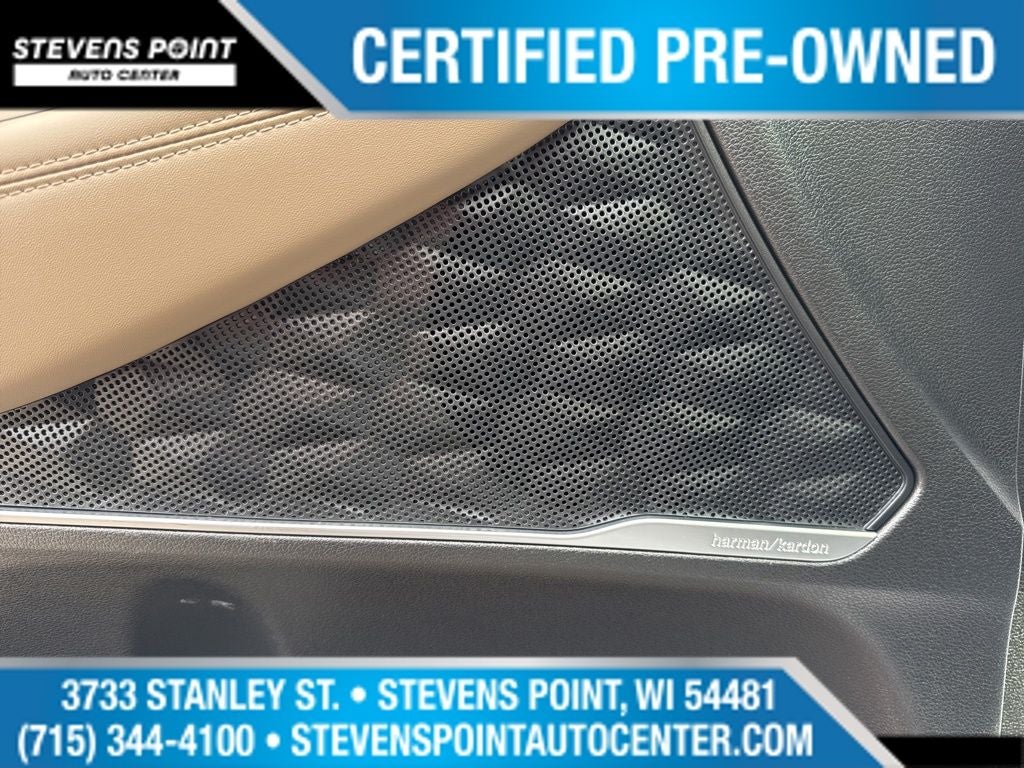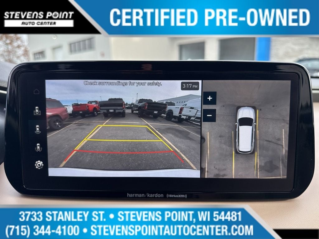 - Radio: AM/FM Harman Kardon Audio -inc: 10.25" wide touchscreen, Apple CarPlay and Android Auto, Bluetooth hands-free w/wireless audio streaming, dynamic voice recognition, USB ports, SiriusXM, HD Radio, Blue Link connected car system, 12 speakers including subwoofer, external amplifier, Clari-Fi music restoration technology, QuantumLogic surround, navigation system including traffic flow w/incident data via HD Radio (HERE), OTA updates (map only), rear seat quiet mode and steering wheel audio and phone controls
