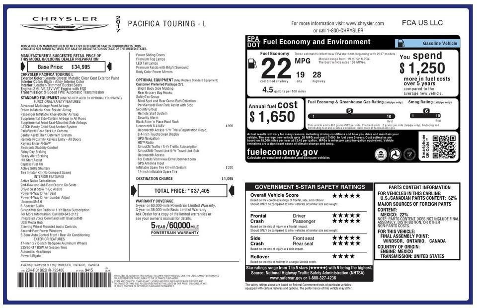 Granite Crystal Metallic Clearcoat 2017 Chrysler Pacifica Touring L 4D Passenger Van FWD 9-Speed Automatic 3.6L V6 24V VVT